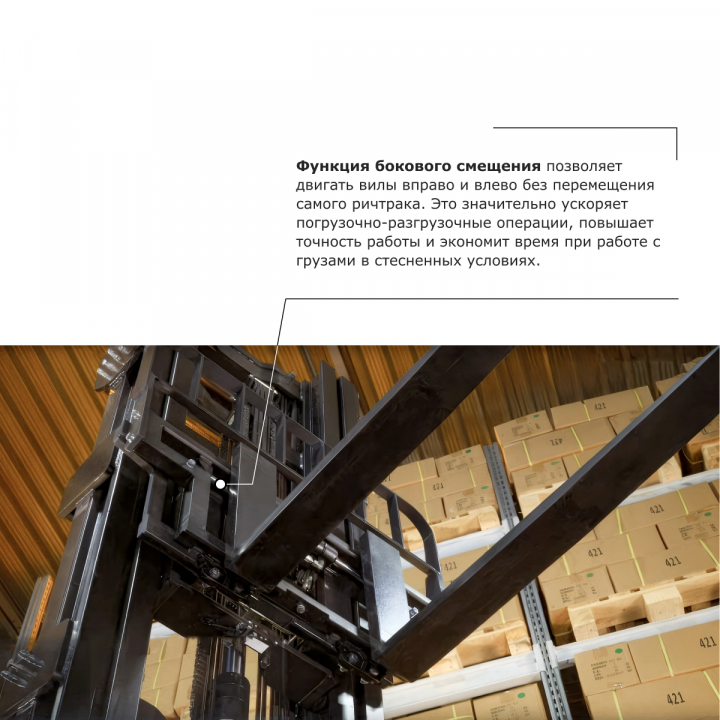 • Функция бокового смещения позволяет двигать вилы вправо и влево без перемещения самого ричтрака. Это значительно ускоряет погрузочно-разгрузочные операции, повышает точность работы и экономит время при работе с грузами в стесненных условиях.